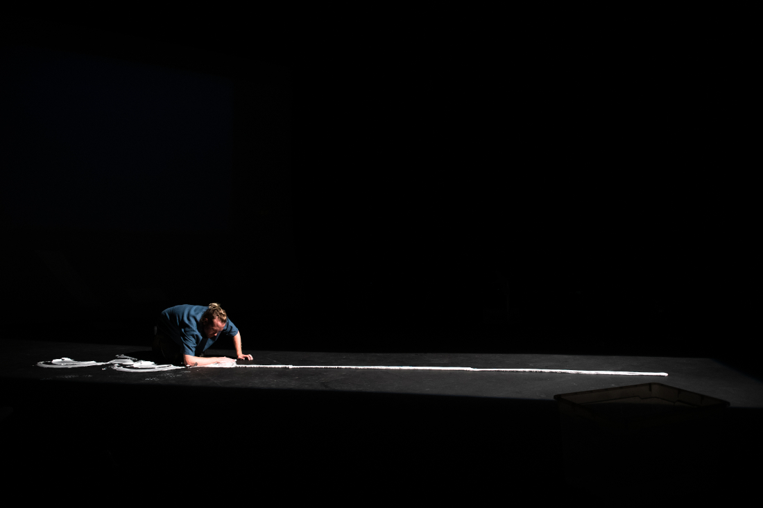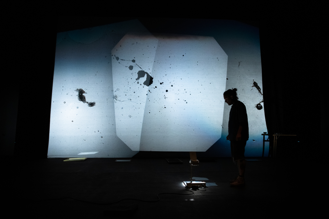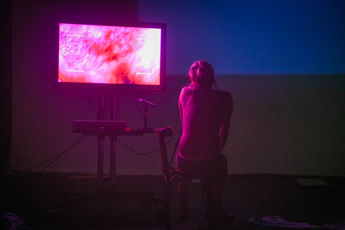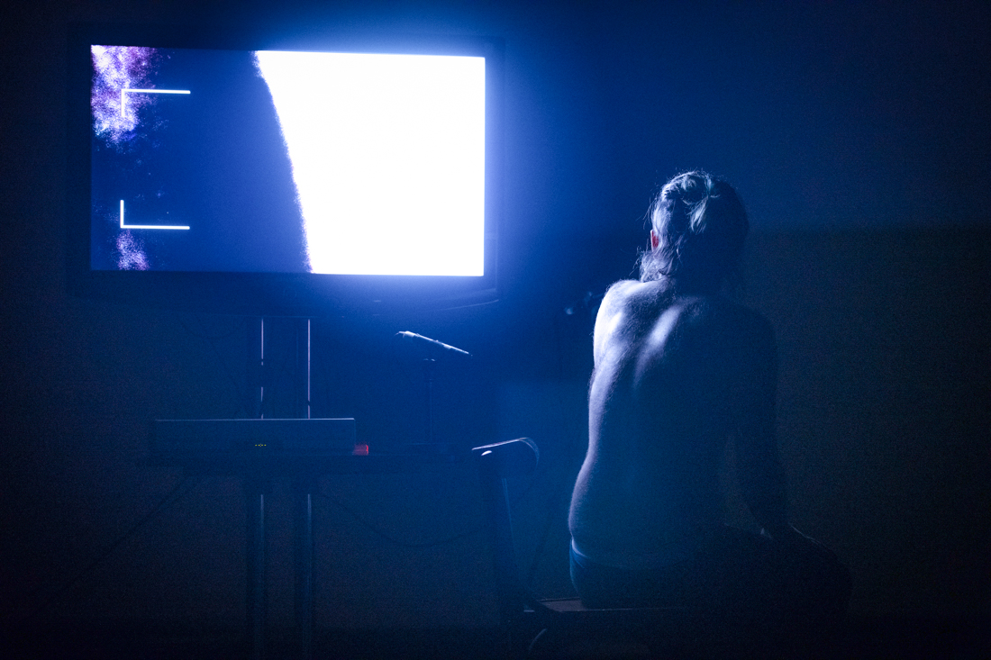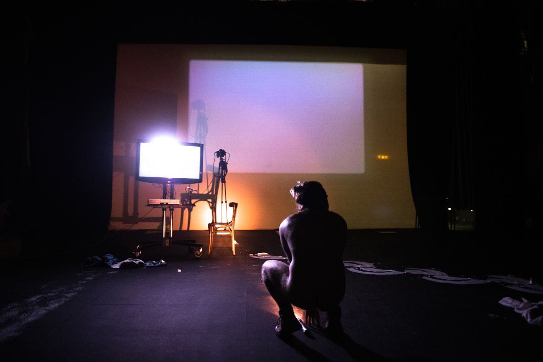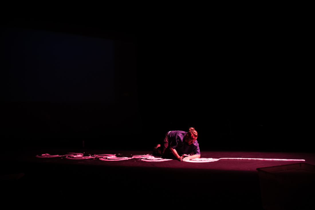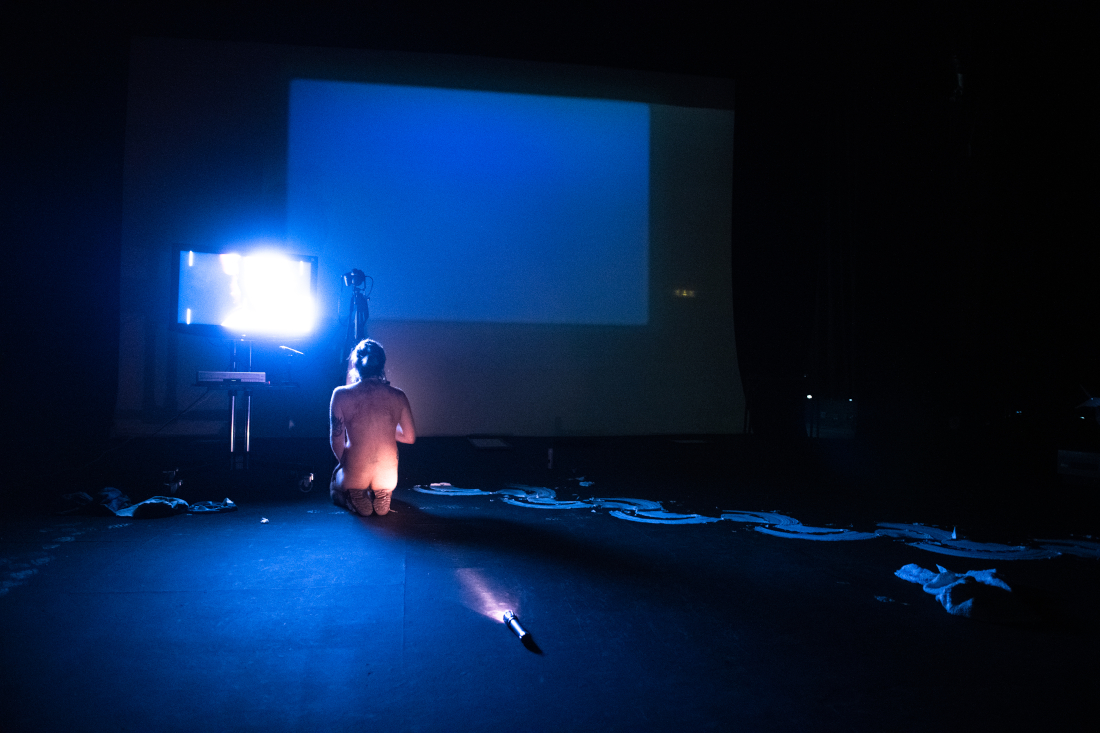 Stain is a solo performance, staged for theatre, that explores an acutely personal relationship to various fluids and viscosities (biological and inanimate) by recalling time travelling fragmented memoirs that address the specific environments and experiences surrounding such fluids. These are collaged alongside bodily interactions with selected materials and technologies, textures, film and light projection - using the theatre as a second body, or skin, that slowly becomes contaminated. These confrontations of uneasiness, intimacies and violence hope to release and purify a new lived body from shame.