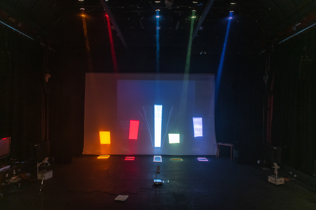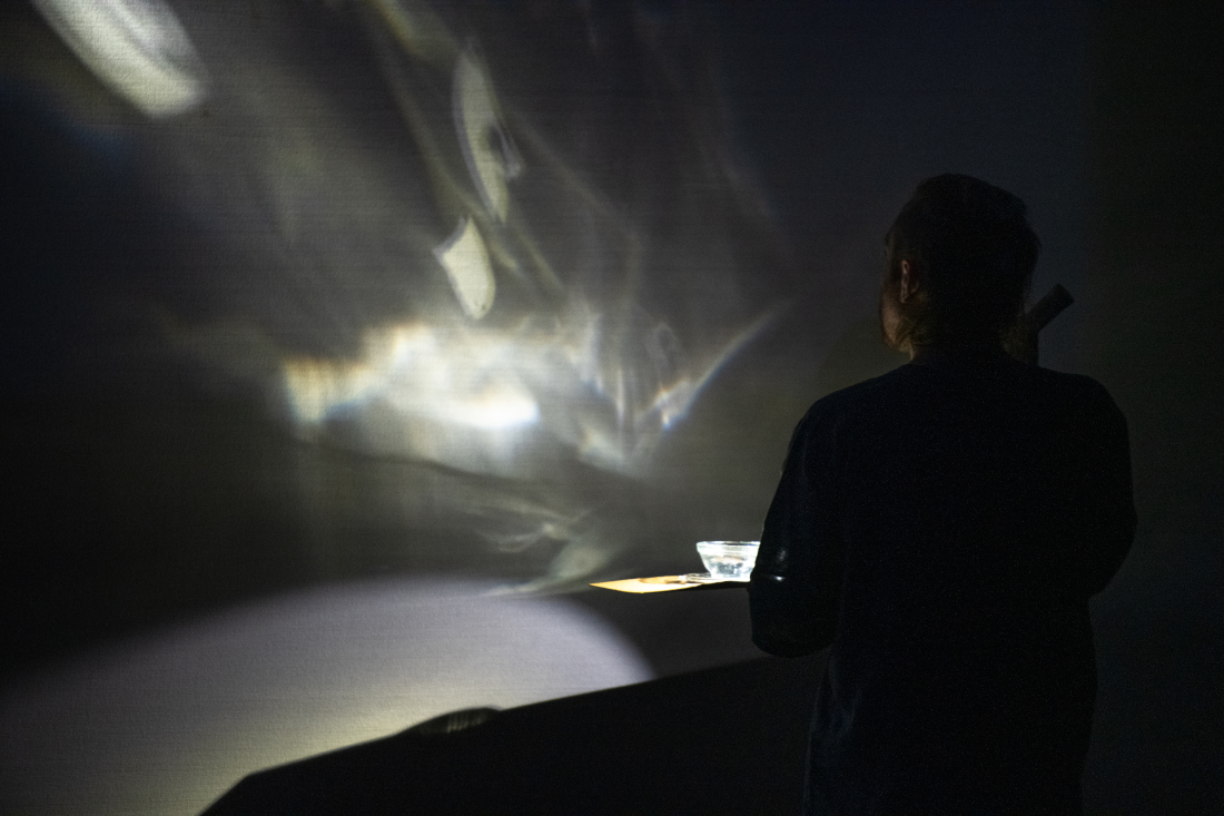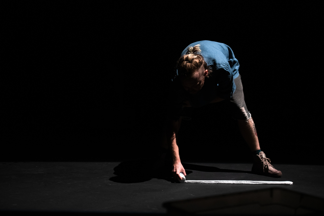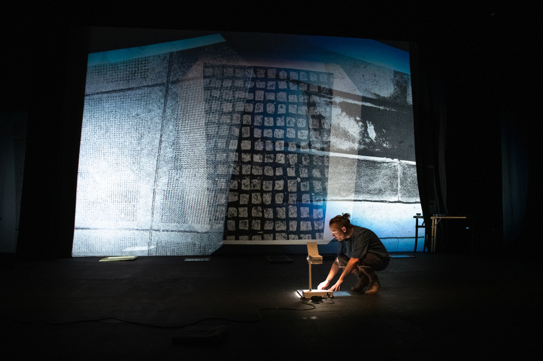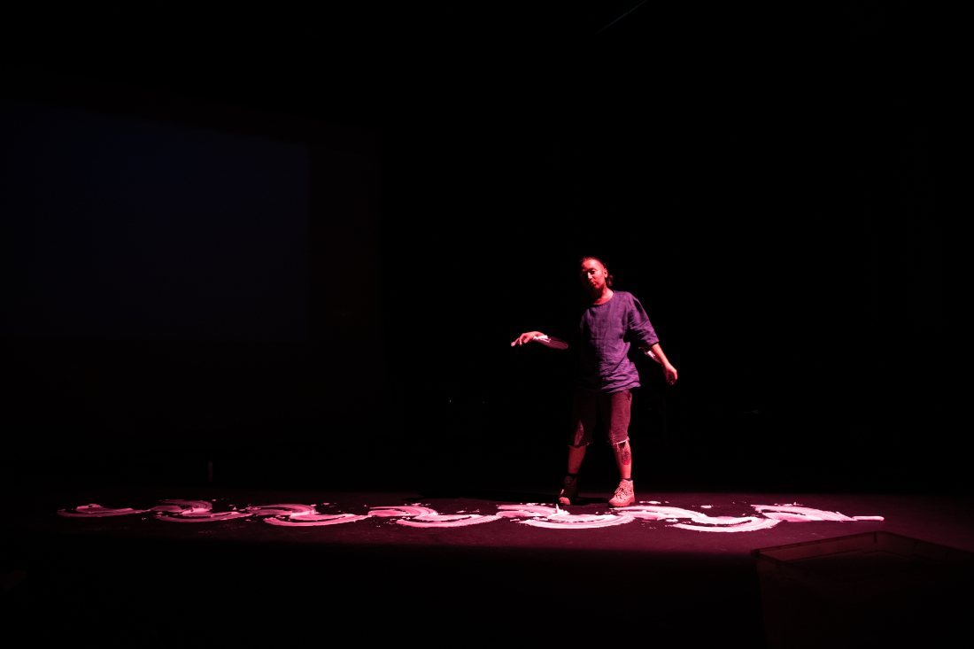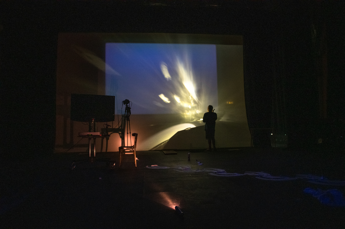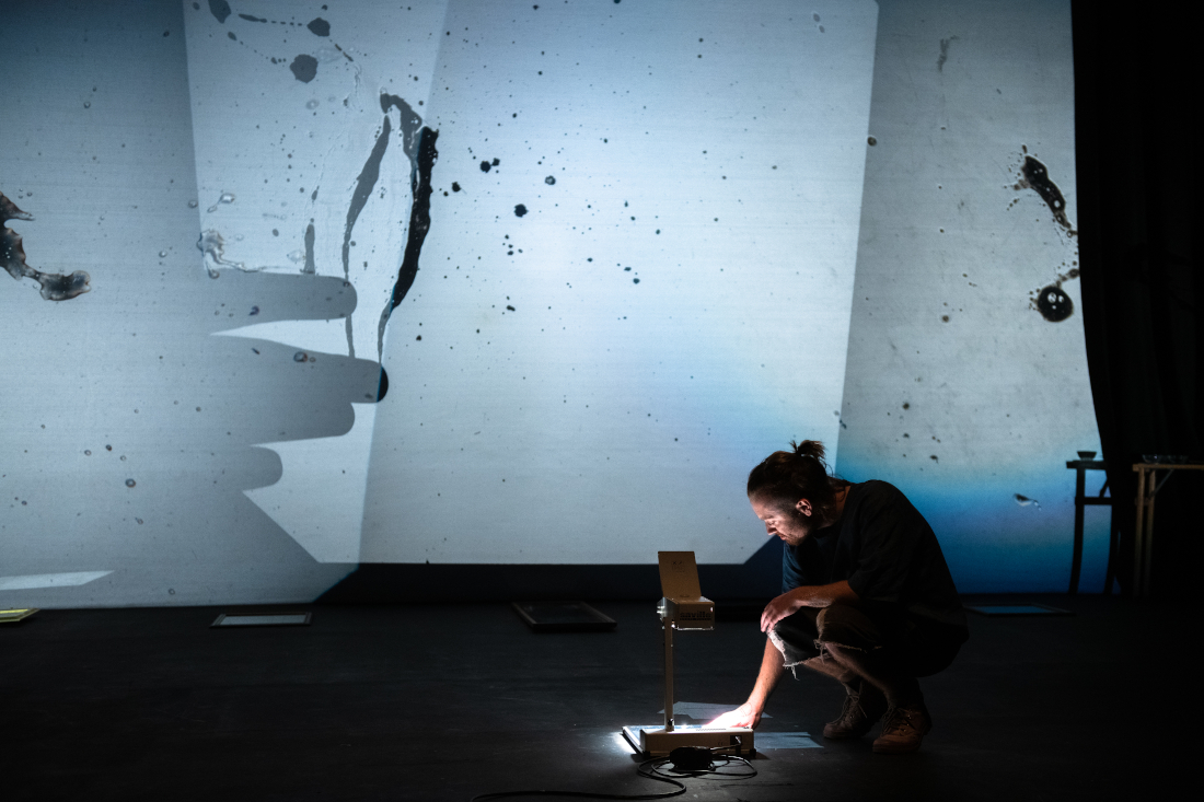 Stain is a solo performance, staged for theatre, that explores an acutely personal relationship to various fluids and viscosities (biological and inanimate) by recalling time travelling fragmented memoirs that address the specific environments and experiences surrounding such fluids. These are collaged alongside bodily interactions with selected materials and technologies, textures, film and light projection - using the theatre as a second body, or skin, that slowly becomes contaminated. These confrontations of uneasiness, intimacies and violence hope to release and purify a new lived body from shame.
