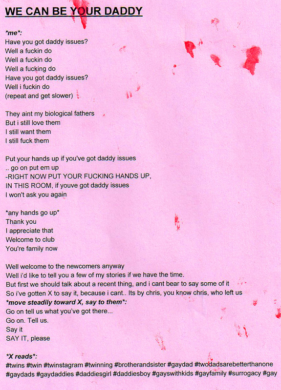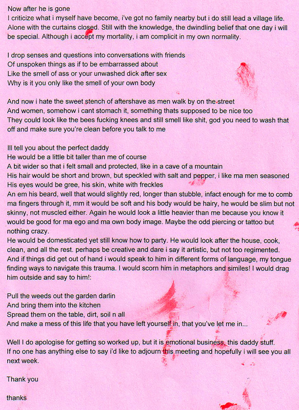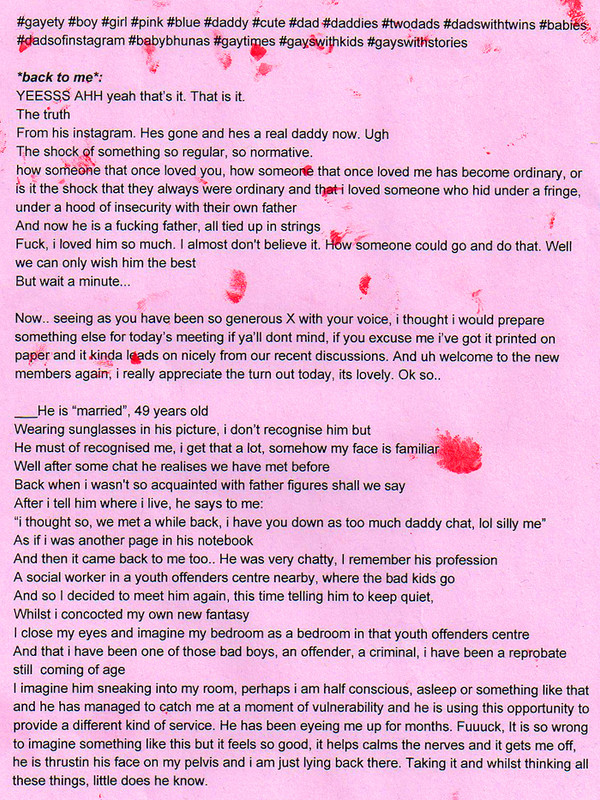 We Can Be Your Daddy was conceived upon the discovery of my teenage ex-first-love’s Instagram account which showcases his new found fatherhood to surrogate twins. The performance expanded upon this shock to imagine the gallery as a mutual-help group for those with ‘daddy issues’.